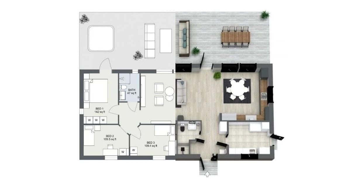 Split bedroom layouts separate the primary bedroom from secondary bedrooms to improve privacy without sacrificing open shared spaces. This type of modern open layout helps reduce noise transfer, improve guest comfort, and support long-term family living. It is especially suitable for families, shared living arrangements, and buyers planning to stay long term.