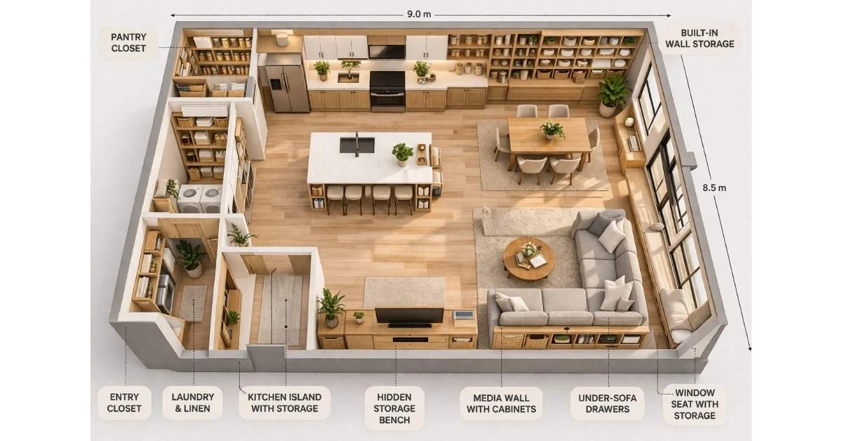 Storage planning is critical for maintaining usability in open homes. Without sufficient storage, clutter quickly reduces the visual appeal of open spaces. Modern layouts therefore integrate storage through built-in cabinetry, hidden shelving, and dedicated entry storage zones.