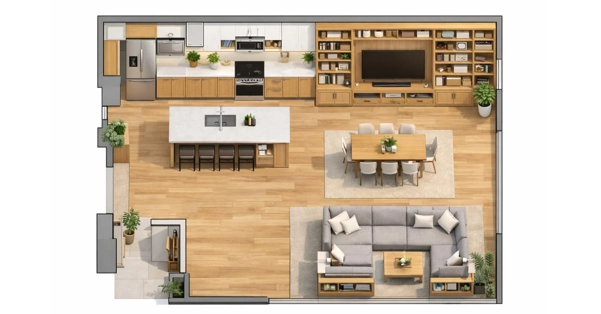A well-designed kitchen living room layout allows cooking, socializing, and relaxing to occur within the same visual space, improving both usability and perceived spaciousness. This layout improves daily functionality by enhancing communication, improving hosting capability, and reducing unnecessary circulation areas. Because it aligns closely with modern lifestyle needs, it remains one of the most reliable open floor plan house plans, particularly for young couples, first-time buyers, and rental investors.