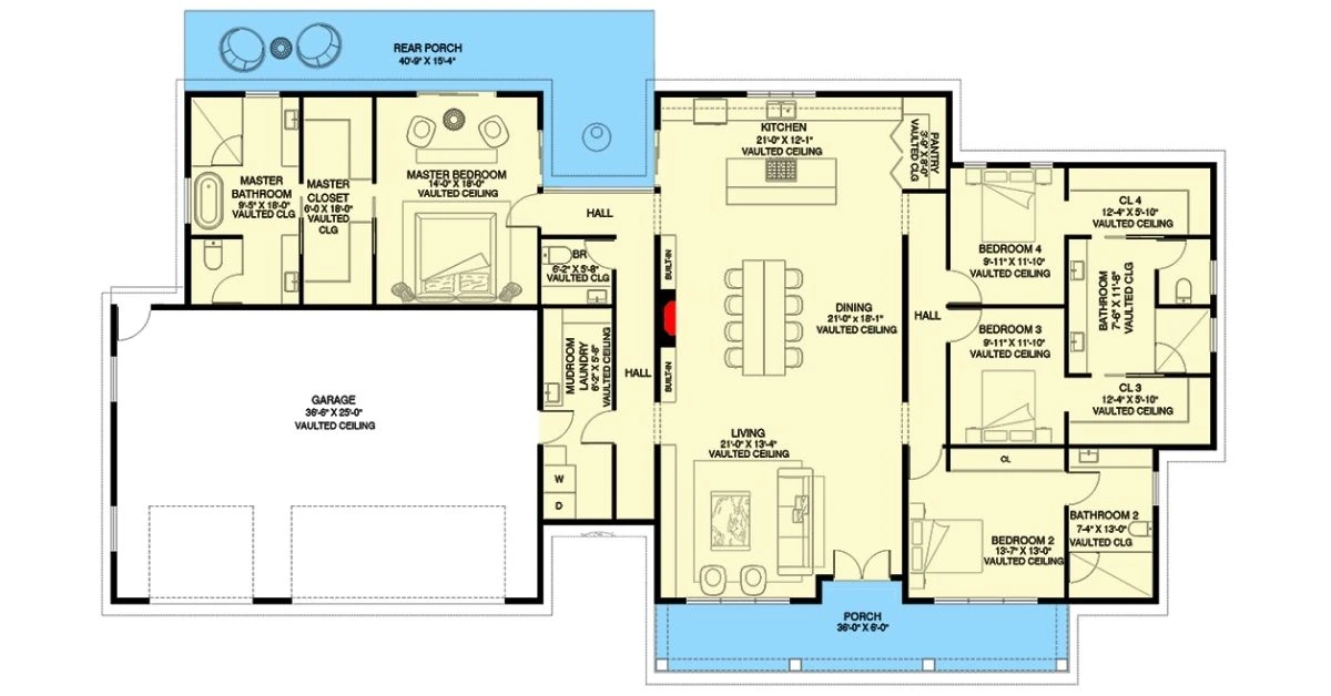Modern open floor plan house plans reduce hallway space wherever possible because these areas provide movement but little functional value.