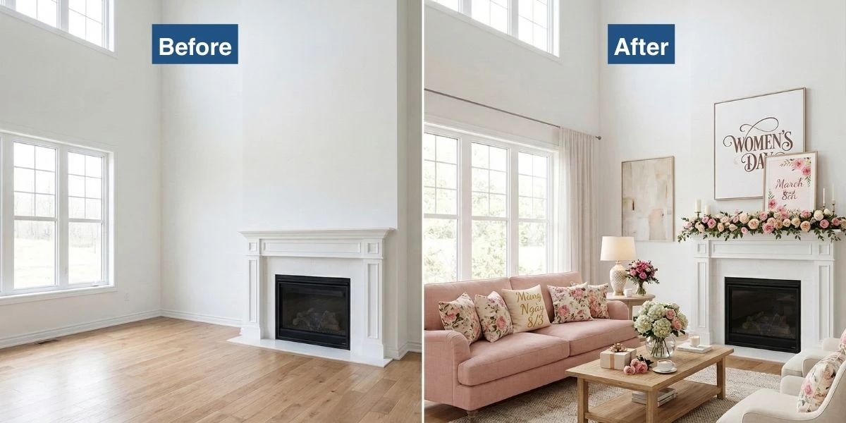 According to multiple real estate marketing studies, virtually staged homes often generate higher online engagement than empty listing photos. During March, using spring-inspired virtual staging can help listings feel fresh and inviting.