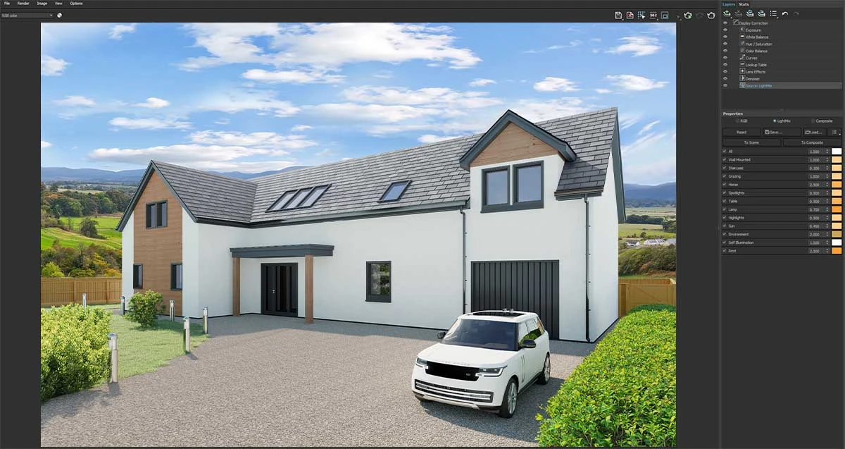 Step 5: Rendering and post-production: High-powered computers calculate millions of light rays to generate the final image. Finally, in post-production, artists fine-tune the colors and add "entourage," e.g., lush greenery, people, and vehicles to bring the scene to life and maximize its emotional impact.