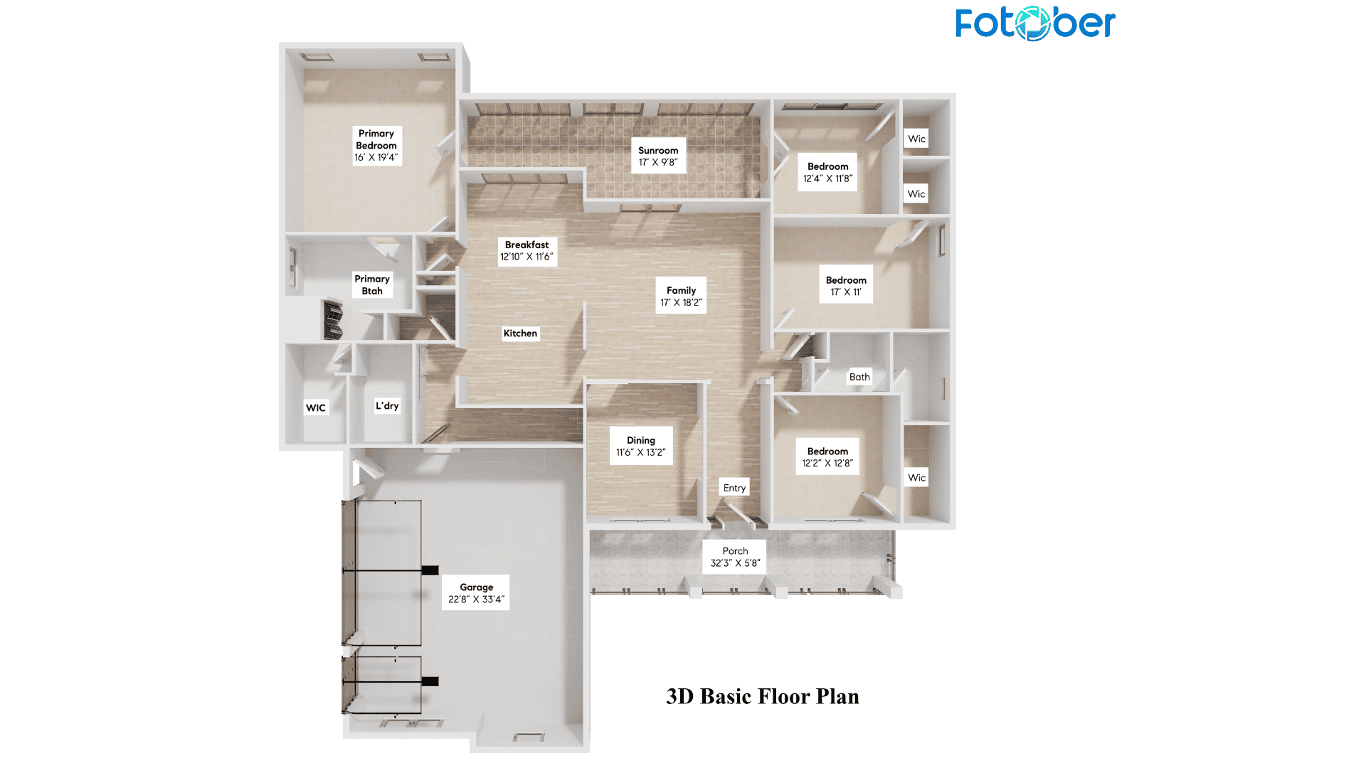 Using the provided information, Fotober’s design team created a realistic 3D rendering of the layout, showing walls, room functions, window placement, and furniture arrangements. Key highlights included: