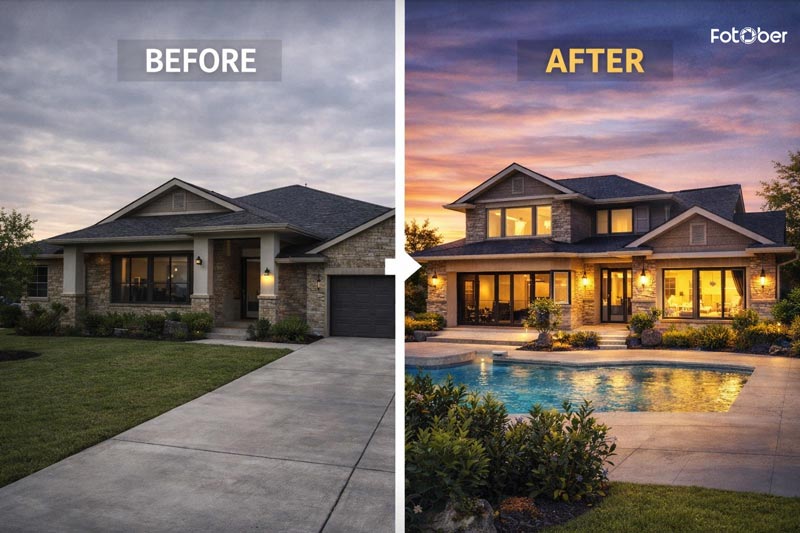 Twilight sessions alone can add $200–$400. Many photographers now offer digital day-to-dusk enhancements as a cost-efficient alternative. Drone and video services add further value. With bundled pricing, this project reasonably falls between: