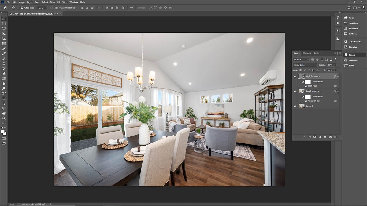 To truly fix sun flare in property photography without losing the fine detail of expensive wallpaper, stone countertops, or wood grain, Frequency Separation is the elite choice. This technique splits the image into two distinct layers: a "Low Frequency" layer for colors and tones, and a "High Frequency" layer for texture.