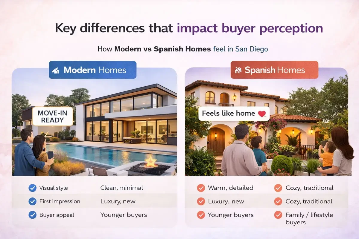 Modern vs Spanish homes in San Diego is a comparison that goes far beyond architectural style-it directly influences how listings perform in today’s competitive market. San Diego is known for its diverse architecture, but these two styles consistently stand out for both buyers and agents.