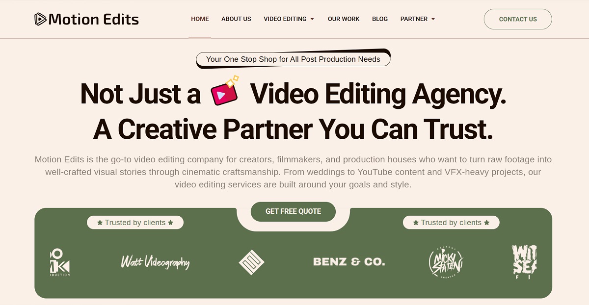 Motion Edits is a wedding video editing studio that leans heavily into the artistic and emotional side of filmmaking, specializing in cinematic "Highlight Reels" and "Documentary Edits."