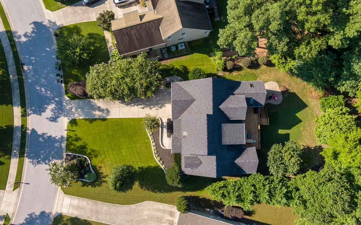 A bird’s eye view typically means capturing a direct, top-down shot from above the property. This view offers a symmetrical, clear representation of the entire layout of the property. Bird’s eye view shots are perfect for showcasing entire properties, large backyards, and gardens. It also provides a visually appealing, geometric layout that can emphasize the architectural design of the property.