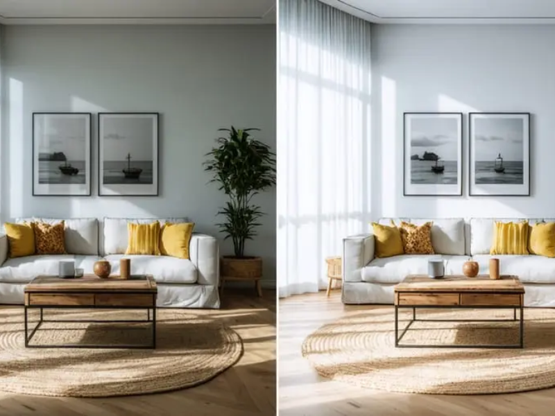 When strong sunlight pours through windows, it often causes two problems: the exterior view becomes overexposed, while the interior remains underexposed and shadowed. This high-contrast situation makes it difficult to showcase both the room’s details and the outdoor scenery in a single shot.
