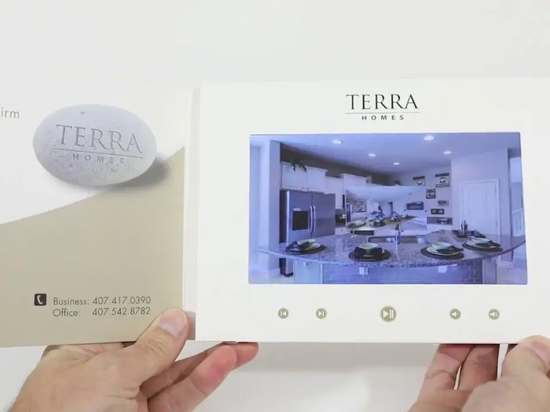 A real estate video brochure is a premium printed brochure with a built-in HD screen that automatically plays video when opened. This unique format allows agents to deliver immersive property tours, showcase key home features, present client testimonials, or even include an agent introduction—right in the palm of the buyer’s hand.