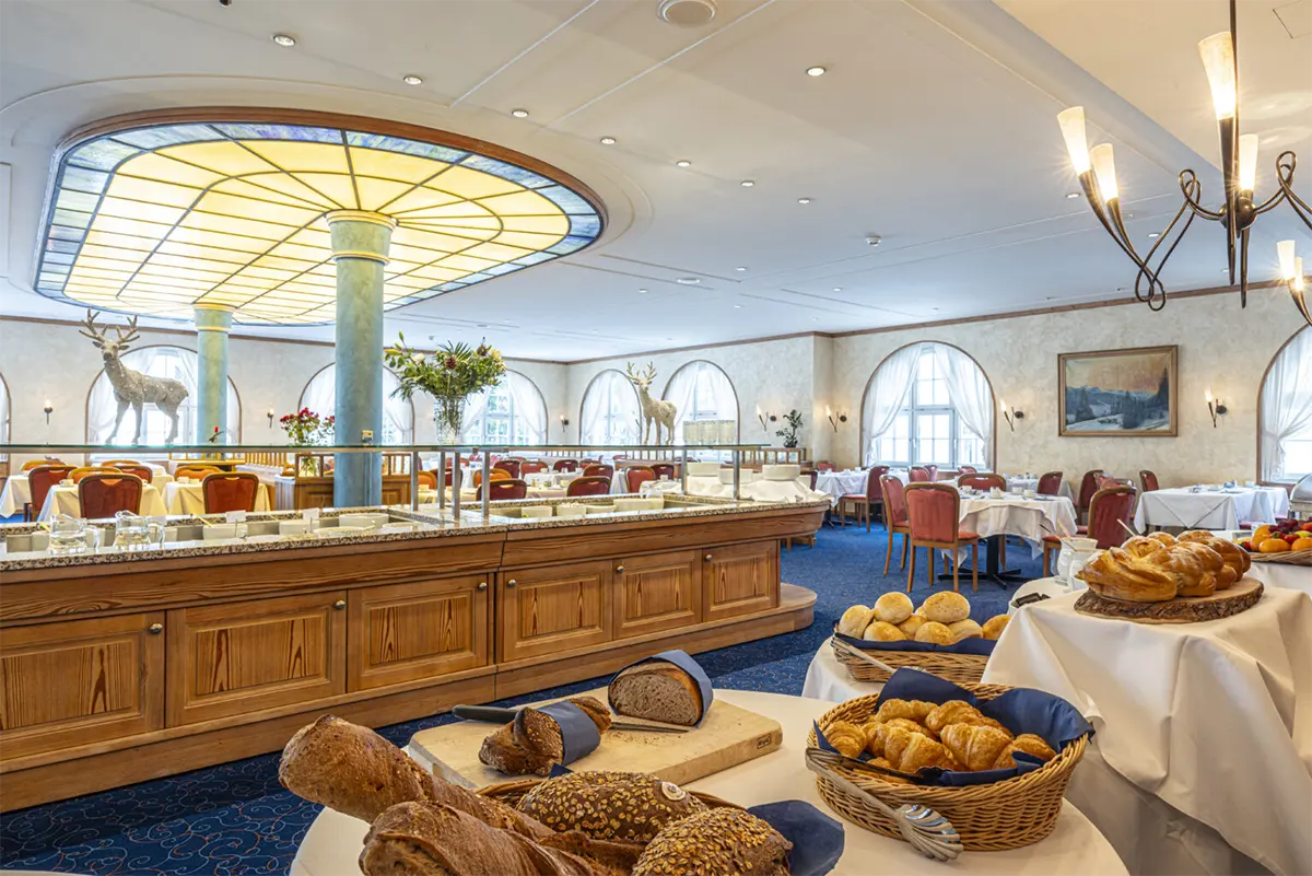 The perimeter layout creates a diners’ zone surrounded by fixed booths and banquettes.