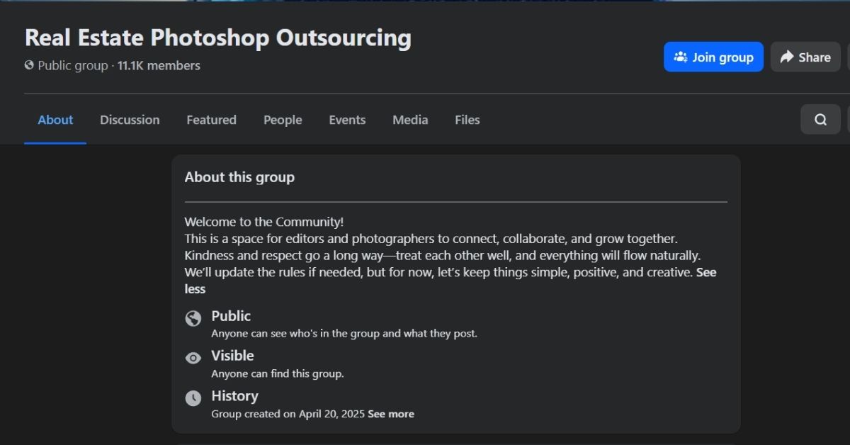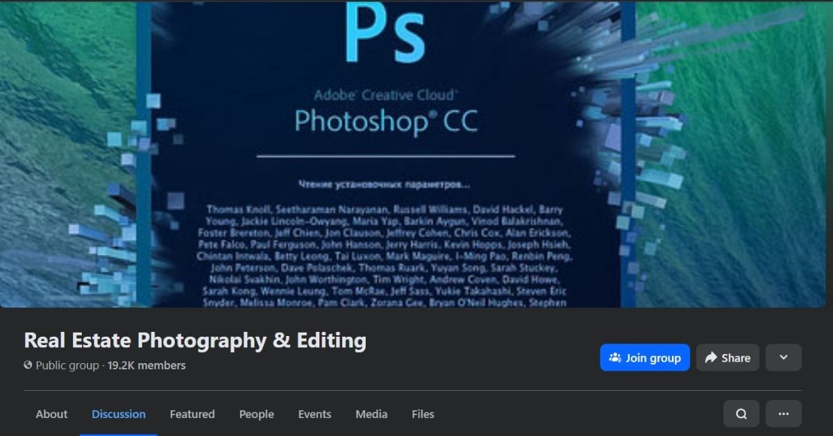 This is a more specialized real estate photography group focused specifically on Photoshop workflows and outsourcing. The discussions are more technical, often involving masking, retouching, and detailed editing processes. This makes it valuable for editors looking to refine their craft.