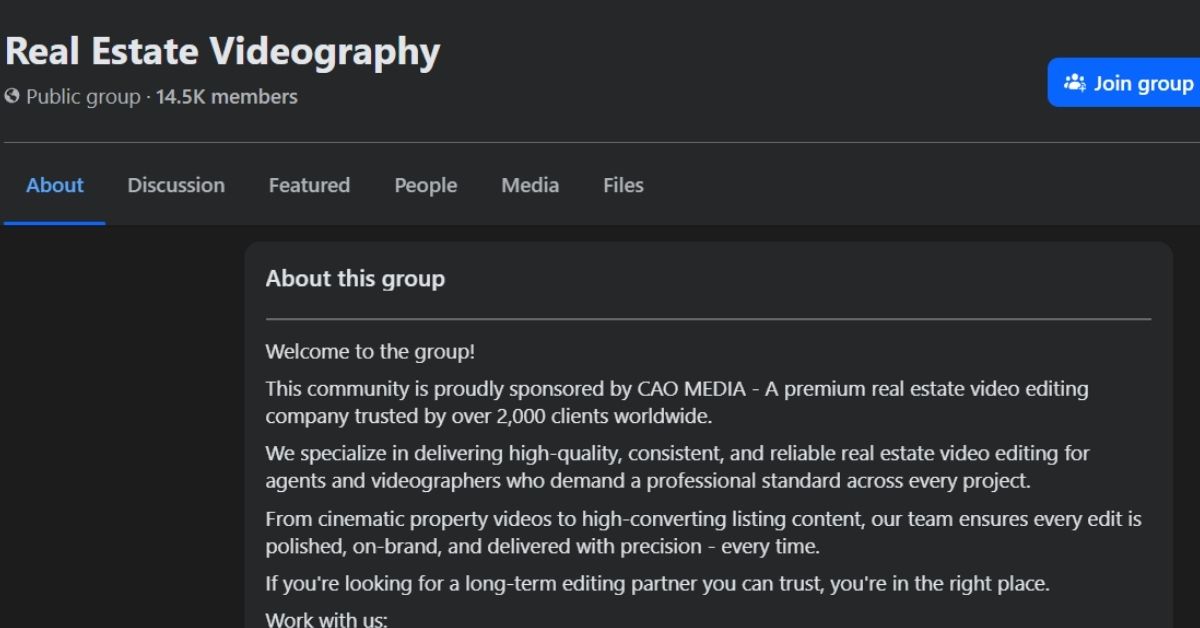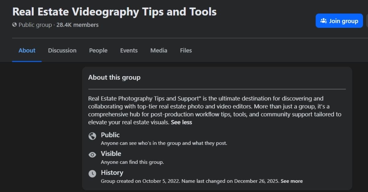 This is a hybrid real estate photography group that covers both photography and videography, but with a clear strength in video-focused content. While you will still find discussions around shooting and editing photos, the majority of valuable insights here revolve around how to create engaging real estate videos. This makes it especially relevant as the industry continues shifting toward video-first marketing.