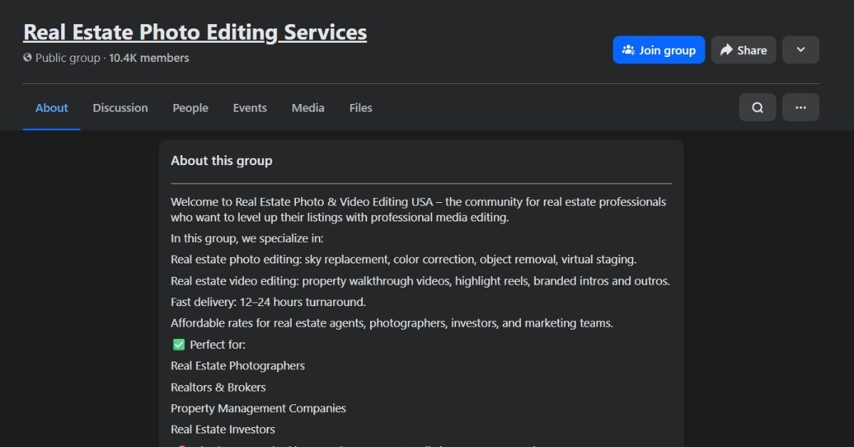 This real estate photography group is highly practical for those handling larger volumes of work. The discussions focus on outsourcing, editing services, and workflow optimization. Many members share real experiences working with remote editors, which provides useful insights into cost, quality, and communication.