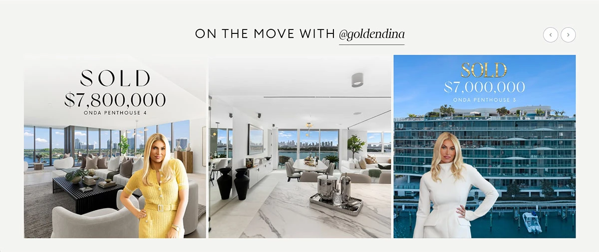 - Visual marketing edge: Dina's marketing is defined by flawless, high-fashion editorial aesthetics. Her listings always feature crisp, magazine-quality photography with perfect twilight lighting. She is a master at using cohesive visual branding across her social media channels, ensuring every property looks like a curated masterpiece.