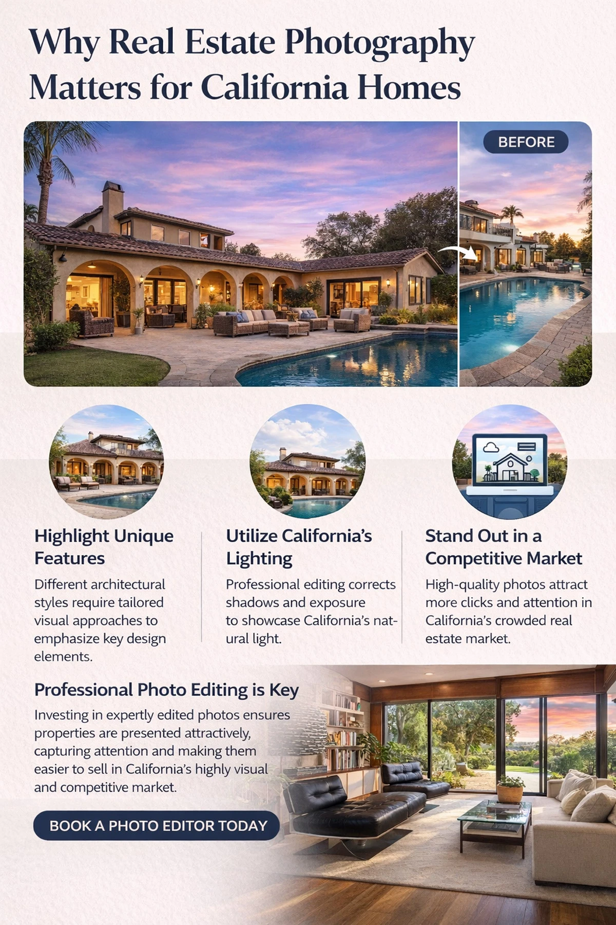 Because California features such a diverse range of residential architecture, editing techniques often need to be adjusted to match the visual character of each home style. Effective photo editing should enhance the design elements that buyers already find attractive while maintaining a natural and realistic appearance.
