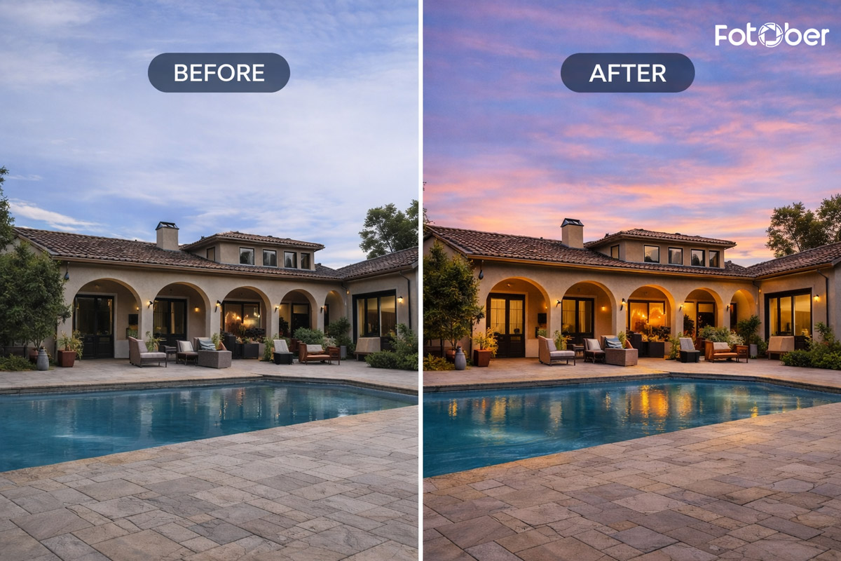 Exterior presentation also plays a major role in attracting attention. In many cases, twilight photo enhancement can transform a standard daytime image into a dramatic evening scene, highlighting landscape lighting and creating a welcoming atmosphere for online listings.