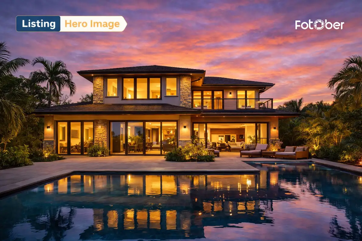 In real estate marketing, for instance, the real estate listing hero image typically appears as the primary thumbnail on property platforms and search results. Buyers often decide which property to view based solely on that first image. A compelling exterior photo—especially a twilight shot—can dramatically increase the chances that a listing receives more views and inquiries.